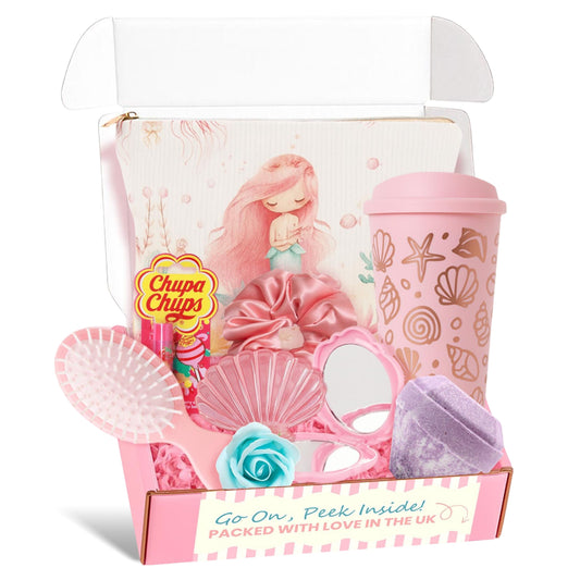 Hug in a Box – Mermaid Treasure Pamper Set for Girls with Cosmetic Bag, Cup, Bath Bomb, Lip Balm, Hair Accessories & Soap Flower