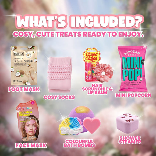 Girls Pamper Set - Spa Headband, Bath Bomb, Cozy Socks, Face Mask, Hair Scrunchie & Sweets