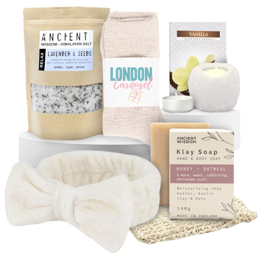 White Pamper Gift Set for Women and Girls – Spa Relaxation Kit with Socks, Headband, Candles, Soap & Bath Salts