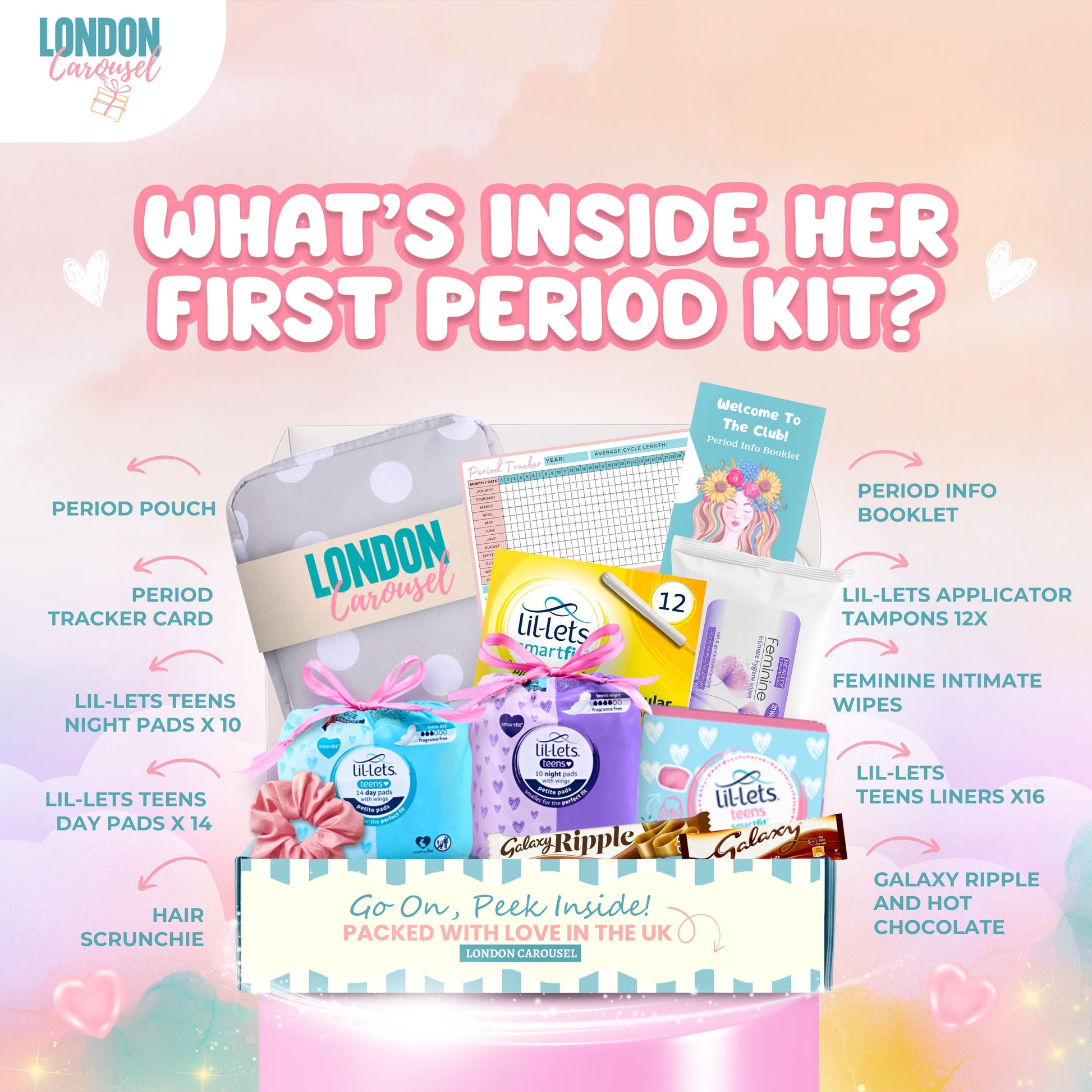 What's included: Lil-Lets Teen Sanitary Towels, Lil-Lets Tampons, Sanitary Pad Storage Bag, Period Wipes, Sweet Treats, Period Info Booklet, Period Tracker