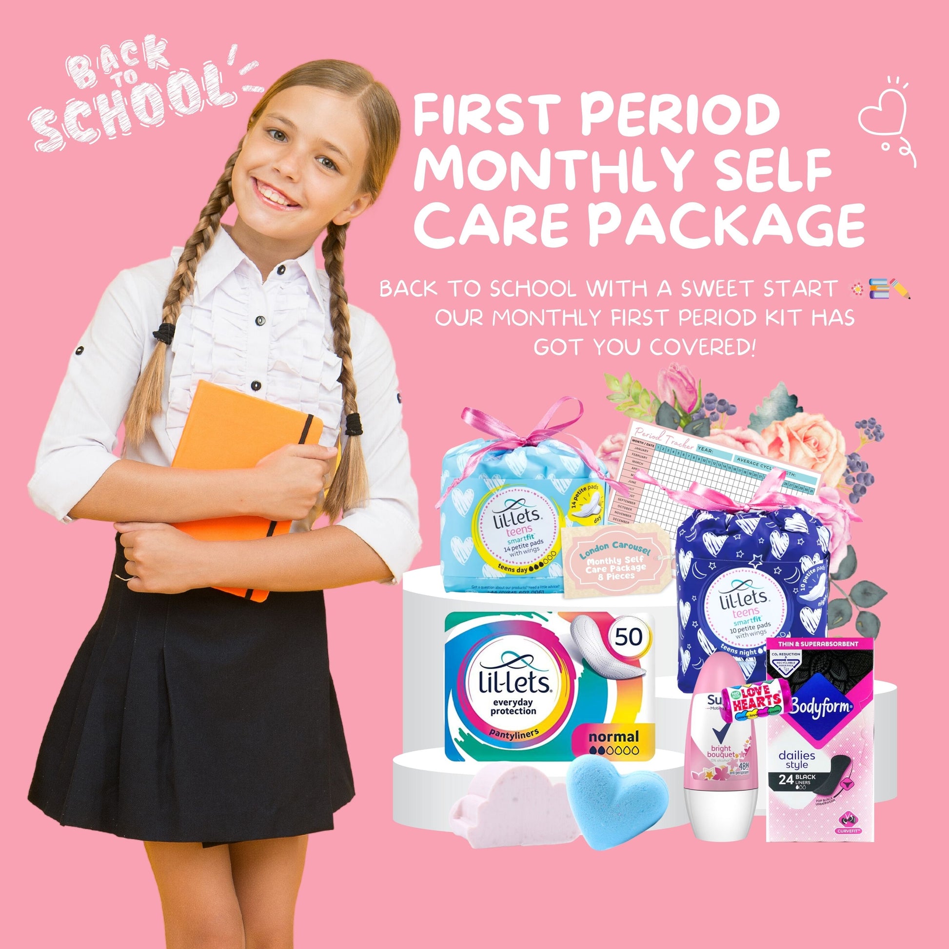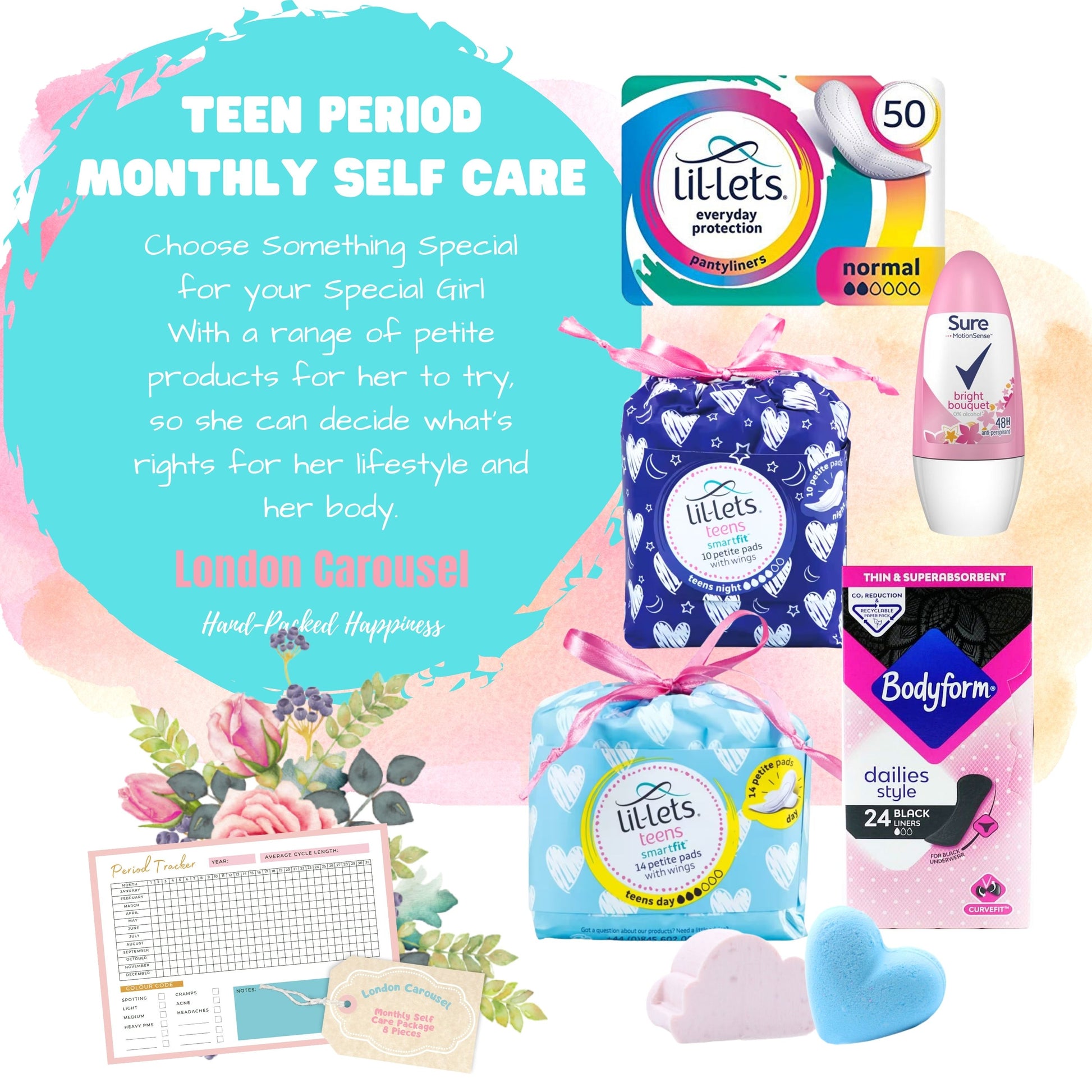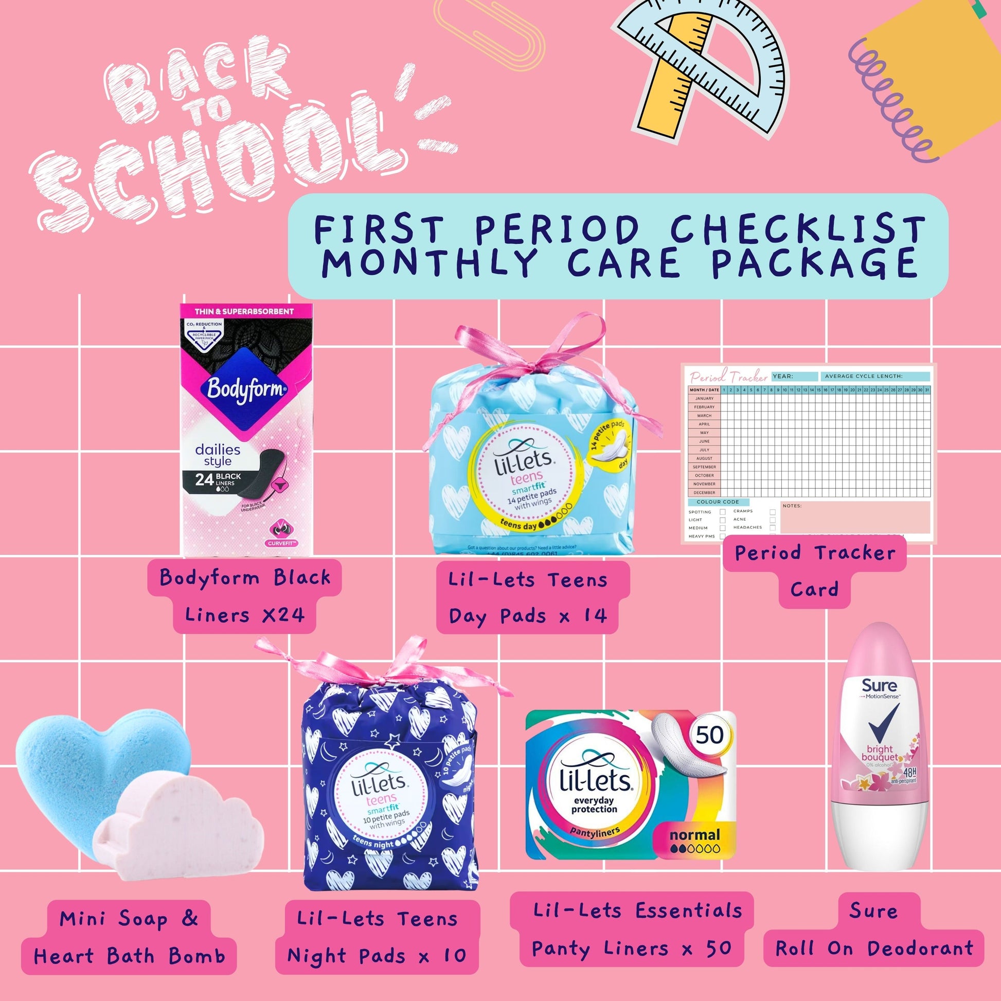 This kit includes essential items like Lil-Lets sanitary pads, Bodyform panty liners, roll-on deodorant, bath bomb, mini soap, and a period tracker.