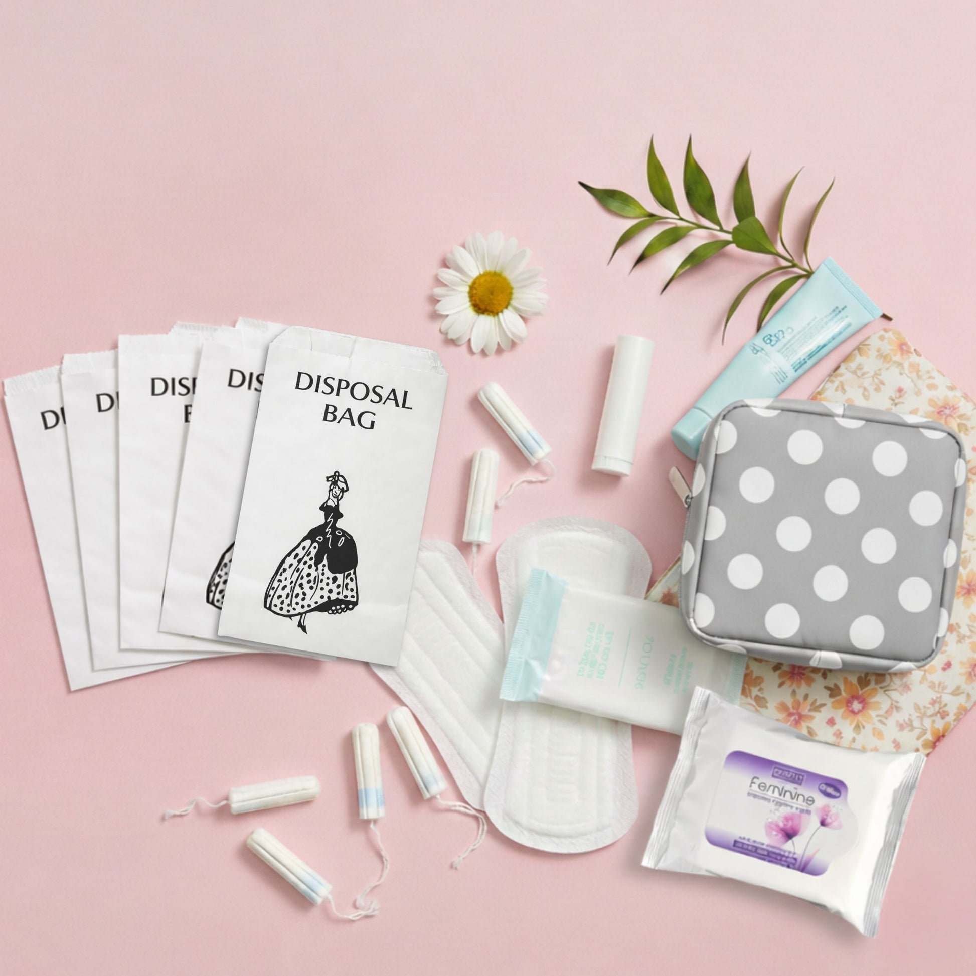 Sanitary Pad Storage Bag: Emergency Kit with Flushable Wipes & Disposal Bags